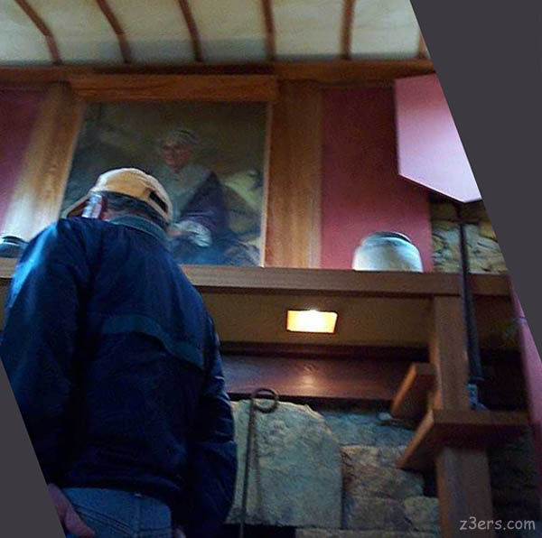 Day Three- 1/4 Lap of America Taliesin Back on ground level, a tourist passes under a portrait of FLW's inspiration, his mother. ![]() ![]() A dining room set. Note the cutouts in the chair backs. ![]() Through patented framework designed doors, note the glass room separator with no post in the corner. |