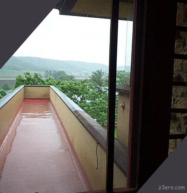 Day Three- 1/4 Lap of America Taliesin ![]() The piŽce de resistance. Mrs. Wright's catwalk- but we're not allowed to go out there in the rain. ![]() Back down the hallway. ![]() |