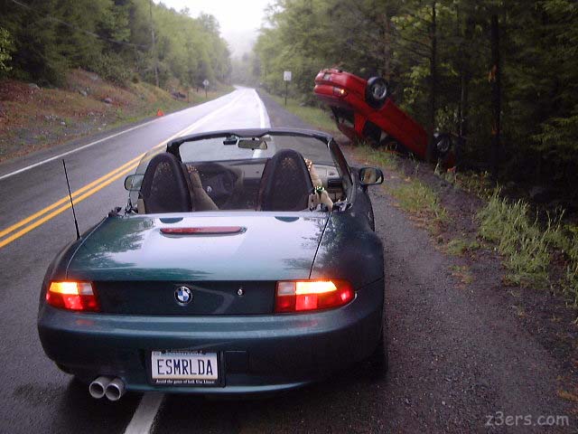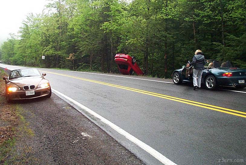 Around a fabulous comfortable bend we found this horrible accident. ![]() The car's lights were still flashing. Afraid that were were woefully ill-equipped to help anyone, we investigated. ![]() No bodies. Didn't think to take the the license number before we drove off. As soon as we knew no one was in there, we high tailed it out of there before something leaked, ignited, and blew up. A sobering moment. |