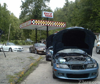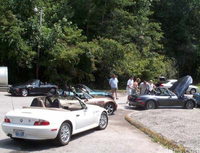 Wednesday- Day 3 Brent (W.B.) and Connie from Missouri and I had decided to get up early and run down Deal's Gap and try to make it to Bridal Veil Falls and back before the Midwest Group got in. So we slept in and said "To hell with it." Hung out and ate breakfast in the Concierge Lounge until it closed. We finally got it together and headed out to Deal's Gap. ![]() ![]() I thought W.B. was going to be a slow rider so I hung back. ![]() Big mistake. Last I saw them on the Dragon and :::poof::: gone in a white flash. By the time I got to Deal's Gap they were snoring. And... they had company. DaveT, Sigmau6, Zeegar and Z3 Power (Nathan) were lined up waiting. ![]()