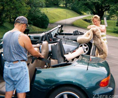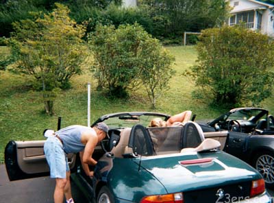 ripped off Emmy's sheeps and beads and threw them in a box provided by the nice folks at the Tapoco Lodge. Nathan writes on Z3Power.net: "This started when she was driving the Dragon and wanted to know, how come she seem not to be able to drive faster and in control of Emmy. I first checked her tire pressures, they were low (HOT). Plus, her tire pressures were higher in the rear than the fronts. So after a while of allowing her car to cool down, I pumped up her front tires to 37 psi and her rear to 35 psi. I explained to Rachel that the higher air pressure is required on sprited driving. During HARD cornering, your tire could in fact roll on her sidewalls - NOT GOOD, the handling will feel like your car is pushing (ie, if you turn and your car is still going straight).. The higher pressure will prevent that. Note, that Emmy's tires did not experiencing this during her runs through the Dragon, but Rachel was not driving hard either. Of course, if you have too high of a tire pressure, you will also start to lose contact/feel of the road. You will have a smaller contact surface between the tires and the road surface. NOT GOOD. So it is a balancing act on air pressures. On the way back to the C.O.T. she said that she could feel a difference on how Emmy drove and she liked it. She then asked if I could give her a ride in my Z3. So off we went. As I was driving, I explained what to do and why to do it. She was impressed. I then asked her about how she feels when she is seating and driving, does it feel like she is sliding in her seat? Rachel said "yes". I told her that then the "shag" and the "beads" must go. These items are great for long distance driving or even everyday driving. BUT, if you plan to do spirited driving, you must be able to NOT have your body moving around. This will prevent you from feeling how Emmy reacts during driving the Dragon or autocrossing. So back at Topaco Resort, Rachel and I started to pull out the "shag" and her "beads". I told her that the back support can stay in, only if it does not move during driving Emmy. Rachel opted to remove them for now. Rachel told me that she will be shipping 1/2 her "shag" and "bead" back home to NY. Rachel then asked me if I wanted to drive the FAMOUS "Emmy", I said "hell yea!" So off we went, what can I say, but, Emmy can drive. She handles nicely. The Porterfiled Brake pads work great, BETTER than my EBC, guess I know what I will get next. I mentioned to Rachel that Emmy handles & brakes great and not to change much more to her. The stock springs and her aftermarket Eibach sway bars and Koni struts and shocks work great together. I mentioned to Rachel that the only thing I would think of adding to Emmy to be a better driving car is a clutch stop, either Ron's or UUC." Anyone want a nice set of used sheepskins- cheap? |