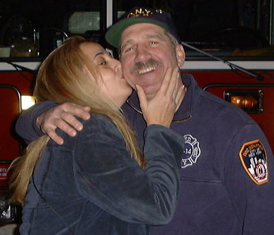 There were neat racks of coats with boots with pants stufffed in them and hats on top like this. This firefighter takes Yogi Bear and the US Flag with him on his helmet.OK so that was all well and good, and they put the boxes of the t shirts in Emmy- well sort of. There were three boxes and two fit on Emmy's passenger seat... sort of.. but the last box had to be opened and repacked in Emmy's trunk. I got back to my building and there is another fire engine company at my front door. An elderly woman had become seriously ill, an ambulance was called and the firefighters got there first. It used to be the sound of sirens lulled me to sleep in New York, we thought nothing of them. Now I always think. Anyway, we were having a chat when the driver invited me to ride with them back to the station. Gee, how long do you think it took me to say "YEAH BABY!"?? What a frikin ride. I got to tell you, the Dragon has nothing on taking a ride in a fire engine through New York City. Unbelieveable! They even let me use the siren. I loved the part where we came through an intersection and an SUV had made the mistake of "blocking the box" and the driver's face was right in front of us as we were in this HUGE fire engine wailing sirens at his broadside. Oh baby, for the thousands of times those big SUVs have intimidated me in my little roadster, it was pure frikin joy to watch this guy completely freak out. It was s riot. ![]() ![]() Oh and in case anyone was wondering, after the holidays the Empire State Building became Red, White and Blue again. ![]() I love this town. I am going to miss it while I am away, and it is going to be hard to leave. |