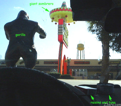 ![]() It was just me and Rock, many oversize sombreros, huge souvenir shops, fireworks and junk food and statues of animals. We settled in a shady spot behind a gorilla's butt for a snack of raisins and canned tuna. Rock got a little of the tuna.