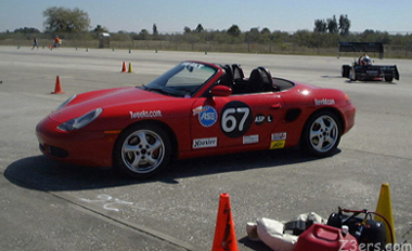So things were going along well when I heard something unusual from Mike: "What the hell is THAT?" Like... Mike knew all this stuff about all the cars and the drivers, but this was something out of the ordinary, and loud. It took everyone's attention as it readied at the gate... ![]() It was exciting to watch it run, faster than anything on the field, running the course in a head spinning 36 seconds. ![]() Coming off the course behind this lovely Boxster... at least I knew what that was... ![]() I tried to catch up with the folks with this car to find out more about it but they weren't in the mood to talk. They probably are tired of hearing "What the hell is THAT?" Mario writes: That winged contraption is a highly tuned home grown beast which runs in a Modified class. Things like that are built by guys who could have designed the space shuttle. Works of art. Yep, you will see all kinds of cars at an autocross. Boxters have become very popular in A Stock. From what I hear their mid engine design makes them very good auto-x cars. |