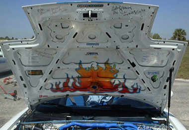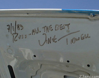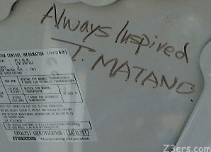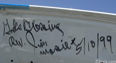 ![]() Russ is a past President of the Everglades Miata Club and these signatures inside his hood are from Vince Tidwell, Past President of Miata Club of America (MCA), Tsutomu "Tom" Matano, Chief of Miata Design and the unofficial Miata Chaplin... Reverend Jim
