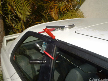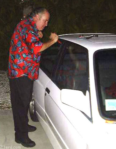 ![]() I don't really understand how the keys ended up locked in the car. Something about automatic locking. (Note that I disabled the automatic locking feature on Emmy's UNGO Car Alarm. If my car automatically locked I'd never get to drive it. :) ) It was late, it was dark, and the M3 got her way and stayed locked for the night with the keys inside. Michel worried that his battery would run down overnight. I wasn't worried, we both have jumper cables and I learned at Z3 Fixit Day '01 how to jump a car from a Z3. |