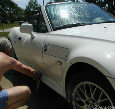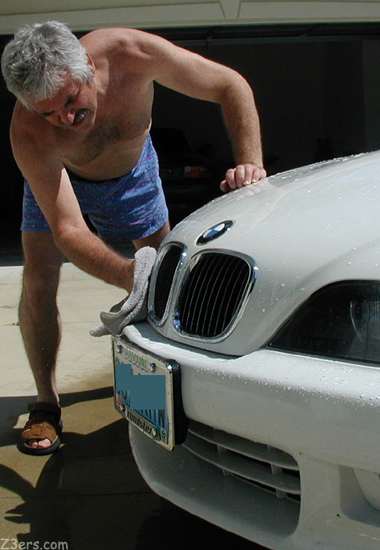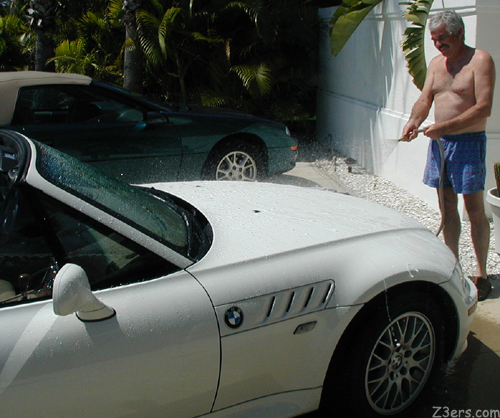 Brent grabbed a hose and had a bit of a REAL Z3 pool party out with the cars... washing his Alpine White Z3 the way Skin Mechanic does- with the top down!