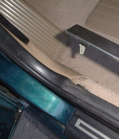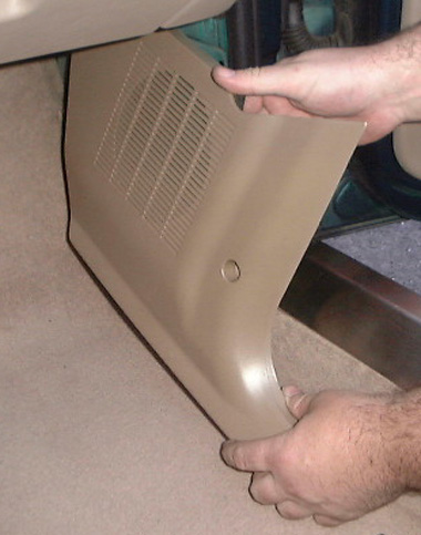 Pull up on your door sills, mine are covered with Legend 5 Aluminum door sills, but that's just stuck on to the plastic piece. Note the post sticking down from the sill. There are three of them, they slide on the sill, match up with the holes below. ![]() A wide flat head screw driver turns the slot in the hole in the kickpanel a quarter turn to release ![]() ![]() Front and back of the passenger side kickpanel ![]()