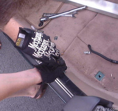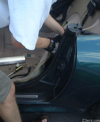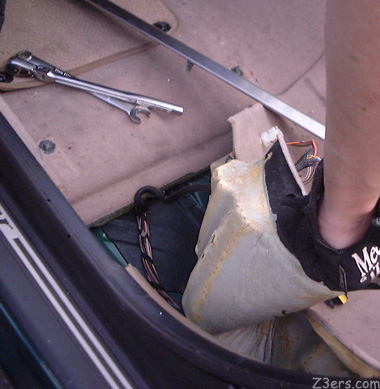 the seat back (leg room only) from removing the decorative foam. ![]() ![]() The tools you see are the ones Shawn was using to remove the seat. He dons work gloves to remove the door sill. You grab the piece about 6 inches in on each side. Then you have to just do one quick/hard yank and it will come right off. Don't be timid about it or you won't get it off. Pulling straight up, releasing three plastic grips. It never works that way when I try it or when JonT tries it or when Dave T tries it, but when Shawn does it... ba da bing. After getting that piece up before you can pull the carpet out there are two screws that need to be removed. Then it just pulls right out. ![]() ![]() Shawn pulls the carpeting gently from the floor and up the side ![]()