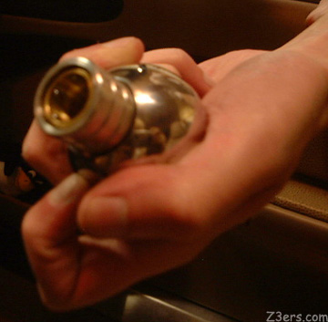 Whalen Shift Knob?" Uh, well, uhm, I heard about all these people who have problems getting their shift knobs off--... huh? That's it? You took it off? ![]() ![]() Shawn writes: To get the shift knob off without giving yourself a black eye you put the drivers seat back as far as you can go. Put the clutch in (handbrake on obviously) and reach over with your left hand and grasp the shift knob upside down so your thumb is closer to the bottom of the shifter. Now with your right hand do the same thing again with your hand upside down. Again here you want to just give it one quick pull and it will come right off. You want to sort of sit in the seat and twist your body a little toward the shifter. Just pull up hard with a quick jerk. Just like the door rocker panel you want to commit to it. DO NOT TWIST THE SHIFT KNOB. When it pops free your hands should naturally move to the left of your face without wacking yourself. Kudos to Ron Stygar for this removal method. To put the knob back on you basically just place it on the shift lever itself and gently rotate it till you feel the tab in the knob lock into the groove in the shift rod. Then just give it a light pound with your hand and it should pop into place. ![]() ![]() Using a Doug Whalen Shift Knob is so easy. Pull the collar back and pop it on. Pull the collar back and pull it off. No sweat. The feeling of the crafted metal ball is very pleasant, the stick is shortened for an easier shorter throw. These pics taken in JonT's car, sorry about the lighting, he doesn't really have fluorescent wood grain. ![]() ![]() Jon and I got to try the feel of the shorter, heavier, rounder shift knob in each of our cars for a couple runs. As you can see, the Whalen Shift Knob sits lower on the shaft, which should please anyone with long arms. Changing the height of the shifter enters into the realm of short shifters, a topic I understand superficially. As I understand it, the only short shifter that really works for Z3s is made by Ron Stygar. One clear advantage of the short shifter is less travel to get into each gear. For that point alone, a Whalen Shift Knob would do the same. The Whalen Shift Knob is also substantially heavier than the oem knob. One source lists the weight of the oem knob at 3 ounces- (I haven't weighed mine) and suggests that any knob weighing more than double the oem weight would cause "wear of the gear or shifter rail"- just like leaving your hand on the shifter would. That brings up the whole "hand on the shifter" debate. I was taught to drive without leaving my hand on the shifter, it does seem to be common sense to me, as I can feel the shifter tremble slightly and assume it would rather move freely than to have resistance in any form. On the other hand, I have lots of friends who drive always with their hand on the shifter, and not only have I never heard of them having a problem, I haven't ever read of anyone anywhere in any car ever having a problem caused by leaving their hand on their shifter. It could be equally argued that the vibrations I allow the shifter to experience are causing wear. Where is there a definitive guide of allowable weights on the BMW shifter that has empirical data available for review or even BMW engineering to back it up? I did find one knowledgeable source that quoted allowable weights, but that article did not reveal the data used to support their conclusions, and that site was selling competitive products to reduce "notchiness" -ostensibly from their own brand of short shifters. Their suggestion was to use a heavier stick for the shifter, or a shift knob that was double the weight of the oem shifter- both of which they will happily sell to you. In my view, without the data to support the conclusion that 6 ounces is the maximum allowable weight tolerance, or a reason to believe that it matters to the gear or shifter rail if the additional weight comes from the stick or from the knob- it's very hard to find firm ground to stand on the subject. One thing I would like to see, is the good folks at LeatherZ.com coming up with some sort of convenient and attractive leather cover for the shift knob on sunny days. Call it a "Knobidom". ;)