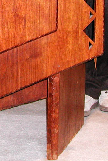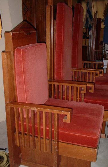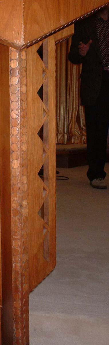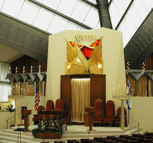 This design of "Winged Seraphim" over the bimah was something Rabbi Cohen lobbied for against Frank Lloyd Wright's first inclinations. 1957 August 23 Rabbi Cohen writes to Frank Lloyd Wright:” I am not happy about the Burning Bush concept, as I have stated in earlier letters, because it is so hackneyed throughout the land. Furthermore, the idea of the Wings – properly done in reds and golds with flaming lights behind them- has not been used and would be more in the spirit of the unique edifice you are creating.” Rabbi Cohen also pointed