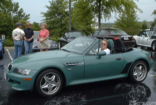 Homecoming 2002 As I wait for my Sunday morning breakfast to be delivered from Second Avenue deli, I am poring over JonT's pics and can't resist posting about my HC 2002. Twelve of the pics are mine, the rest are Jon's. I hope Jon will forgive me for posting his pics before he even gets home, or Roanoake, Virginia, where he is headed right now. I would call him but his cellphone went on all the wet rides at Dollywood with Tim and Irene UK, and unfortunately his phone couldn't swim. I couldn't drive to HC this year because of Mom's tenuous stay in the hospital, but I got to do the parts of Homecoming that mean the most to me. BMW may have stopped making the Z3s but the Z3s have not stopped making friends. As my friend (and friend to all Z3s) Michel Potheau, President and Founder of the BMW Car Club of America always says: "It's not about the cars, it's about the people, dummy." The best thing about Homecoming is seeing the people I have grown to love so well over 5 years and 2 continents all in one place, with loads of Z3s. As I write this, 500 Z3s are driving home, when they get back they will post hundreds more photos and stories... This is only about 50 pics, a big difference from the 58 pages I posted of last year's HC01- which were eclipsed by the tragedy of 9/11. I posted at 3am September 11, 2001, before the whole world changed, the Russian Tea Room closed and the last Z3 was produced. Dr Biggly picked me up at the airport in his pickup truck. He used to have a Z3... one day he will have an MZ3, or MZ4. Within a minute we found a Z3 to follow into Greenville. Upon closer inspection the plate identified real RoadsterGal Betty ///M, MS PILOT from Virginia. ![]()