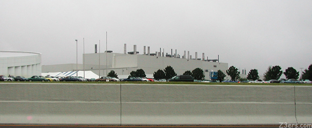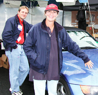 I was unbelievably lucky. I got a room upgrade to a jacuzzi (and those of you who have been following my Construction Drama know how I feel about jacuzzis) when the Wingate ran out of regular nonsmoking rooms. One of my raffle tickets won a front row spot for the Homecoming Panoramic, I gave the ticket to Brent and Connie because my car wasn't there. They let me stand with them, so I got to take a nice long jacuzzi, have nice leisurely breakfast, ride out to the factory nice and warm with a full night's rest. VERY unusual for Homecoming! ;D By the time I got to the factory of course the cars were already lined up, we could see them from the highway in the rain.
