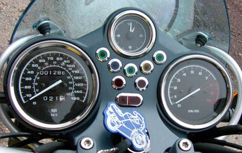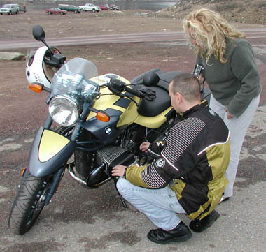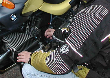Mike shows the air flow through the motorcycyle, air intake under the seat, into the cylnder and straight to the exhaust, with a small inconvenience of being exploded in the engine to rocket the rider into outer space on the way out. In this jacket, Mike's arm looks like an extension of the bike, as man and machine work as one. Welcome to the BMW R1150R. With all these colored lights, every day is Christmas. biggie Wolfgang even has 4 representative gill strokes matching the Z3 gills- or is it that the Z3 gills match the BMW R1150R?