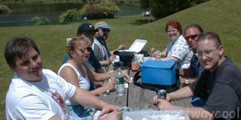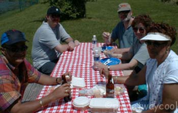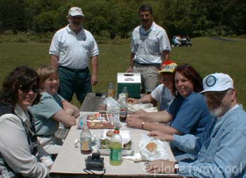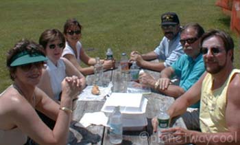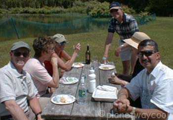 Visiting each table I found that one of our 3 cruise virgins had brought a bottle of wine and proper wine glasses. (Keith, there has been a request for wine glass holders for the Z3) at another table was a red and white checked table cloth and Darlene was serving patł at another. So if you put us all together we could have opened a little restaurant.