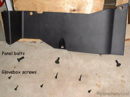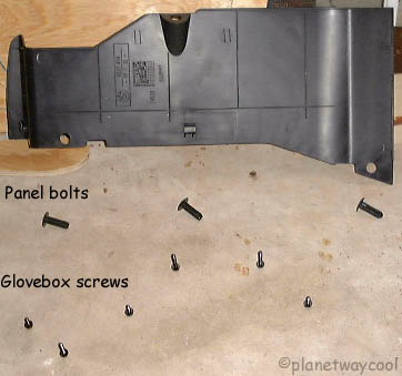 Turn the bolts 1/4 turn with the butter knife and remove. Pull off panel. Note where the panel fits into slots before you remove so you can replace the same way. And be sure to note the order of the different sizes and placement of glovebox screws! |